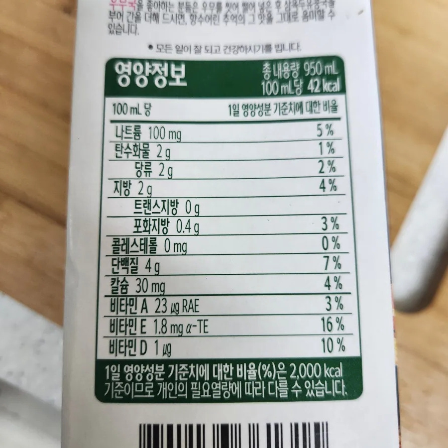 삼육두유의 대두 고형분은 9%로 외국산이 나옵니다. 그리고 나머지 ~~ 여러 가지가 들어있어요.