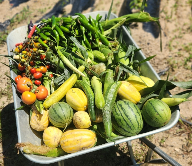 오이고추, 청양고추, 옥수수, 토마토, 오이, 가지, 애플수박, 참외를 거둡니다.