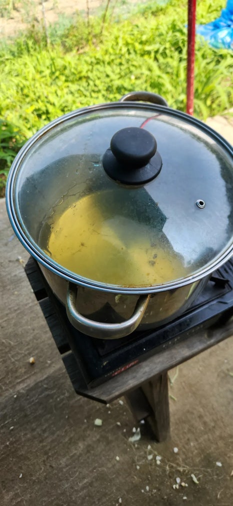 옥수수 껍질을 까고 옥수수를 삶아요. 보글보글~ 이번 옥수수의 비법은 어머니 비법~ 올리고당과 소금을 넣었습니다. 음~ 뉴슈가도 설탕도 없는 빈약한 살림인데.. 올리고당이 마침 있어서 올리고당으로 간을 합니다. 달달하니 국물에 넣어서 삶았어요. 역시 간의 도사~ 어머니~