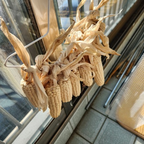 잘 말려서 세탁소 옷걸이에 걸어 둔 옥수수