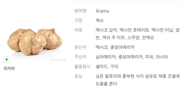 우리나라에서는 멕시코 감자 또는 얌빈이라고 불리며 당뇨, 대장암 등의 예방과 치료에 효과적이며
