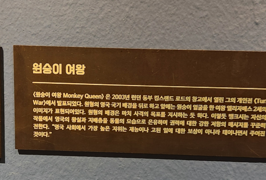 이번 전시의 페스트 컨트롤( 뱅크시가 직접 설립한 회사로 뱅크시의 작품을 판매하거나 진품 여부를 판정해 주는 회사)의 정식 승인 작품 29점과 영상 작품을 포함한 약 140여 점의 작품 전시로 국내 최대 규모라고 해요.