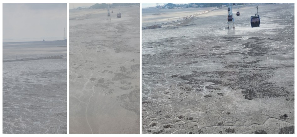 물이 빠져서 갯벌의 모습입니다. 갈매기도 아래 점처럼 보여요.