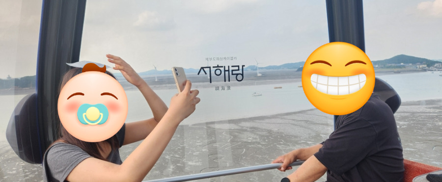 케이블카 앞에서 얼굴을 덮어 줍니다. 케이블카 안에서는 모두 안으로 쏘옥~ 넣어야 합니다. 더운 달달한 마루 씨~ 전곡항 3층 호연담에서 전곡 항을 한눈에 볼 수 있는데 더워서 이것도 포기~