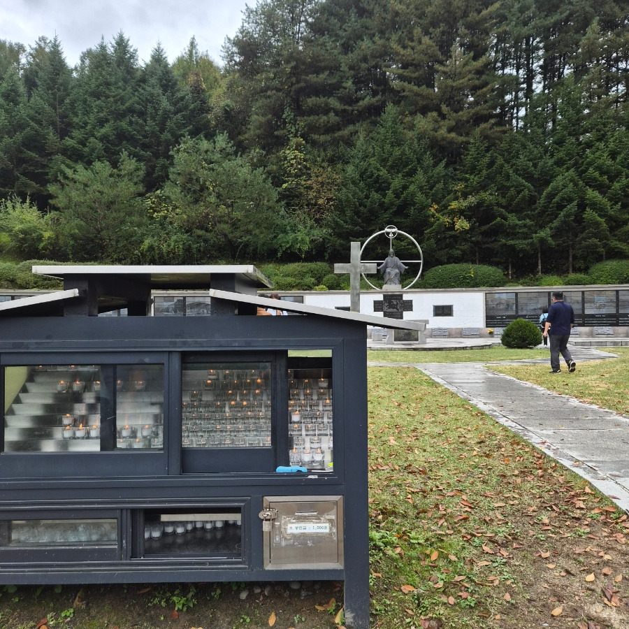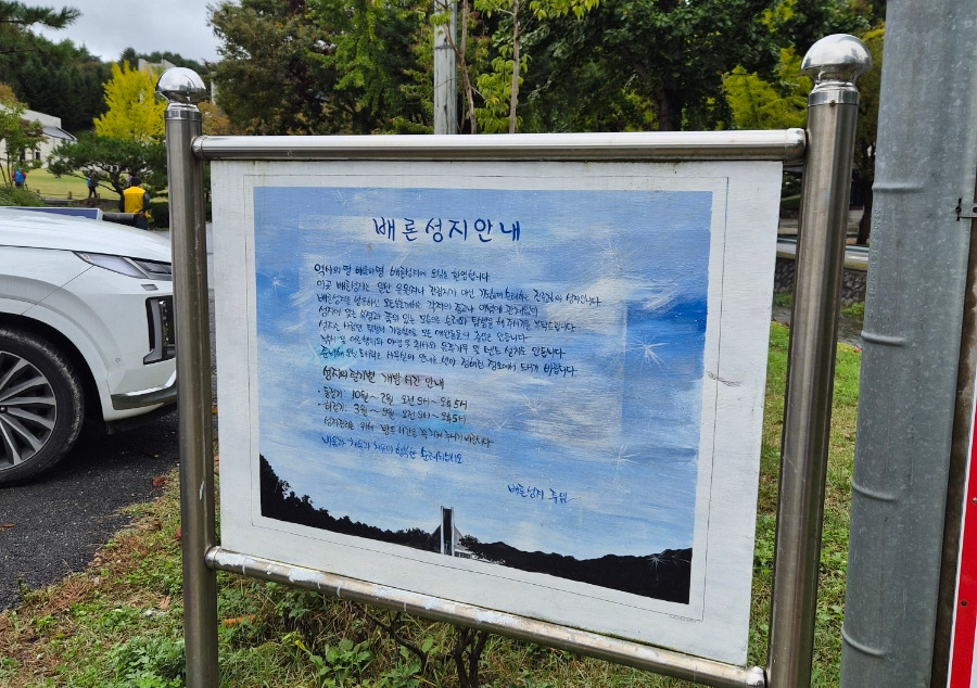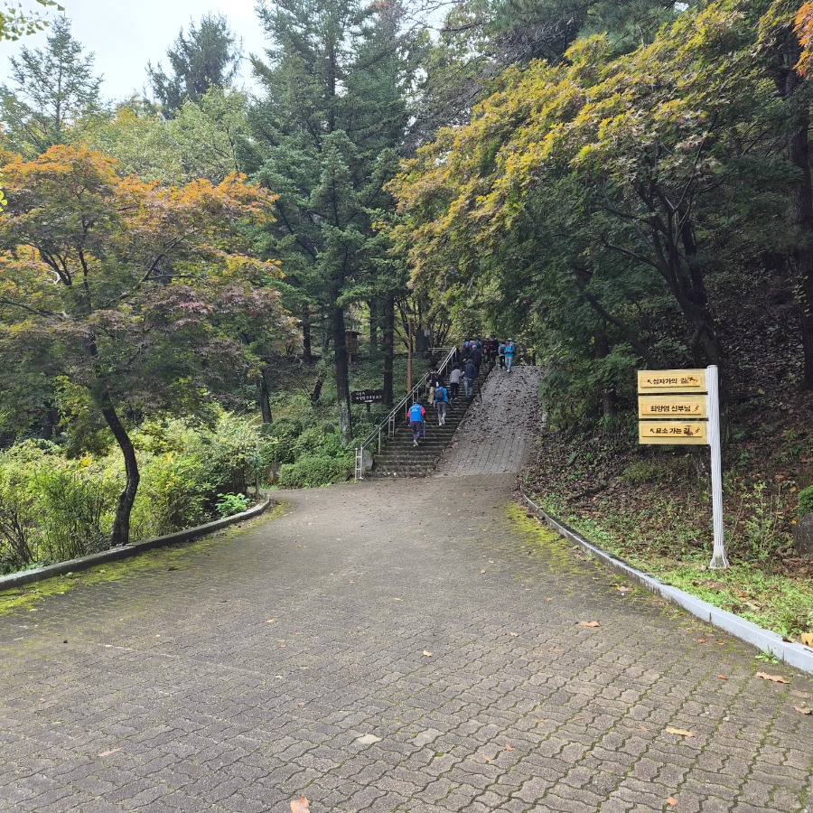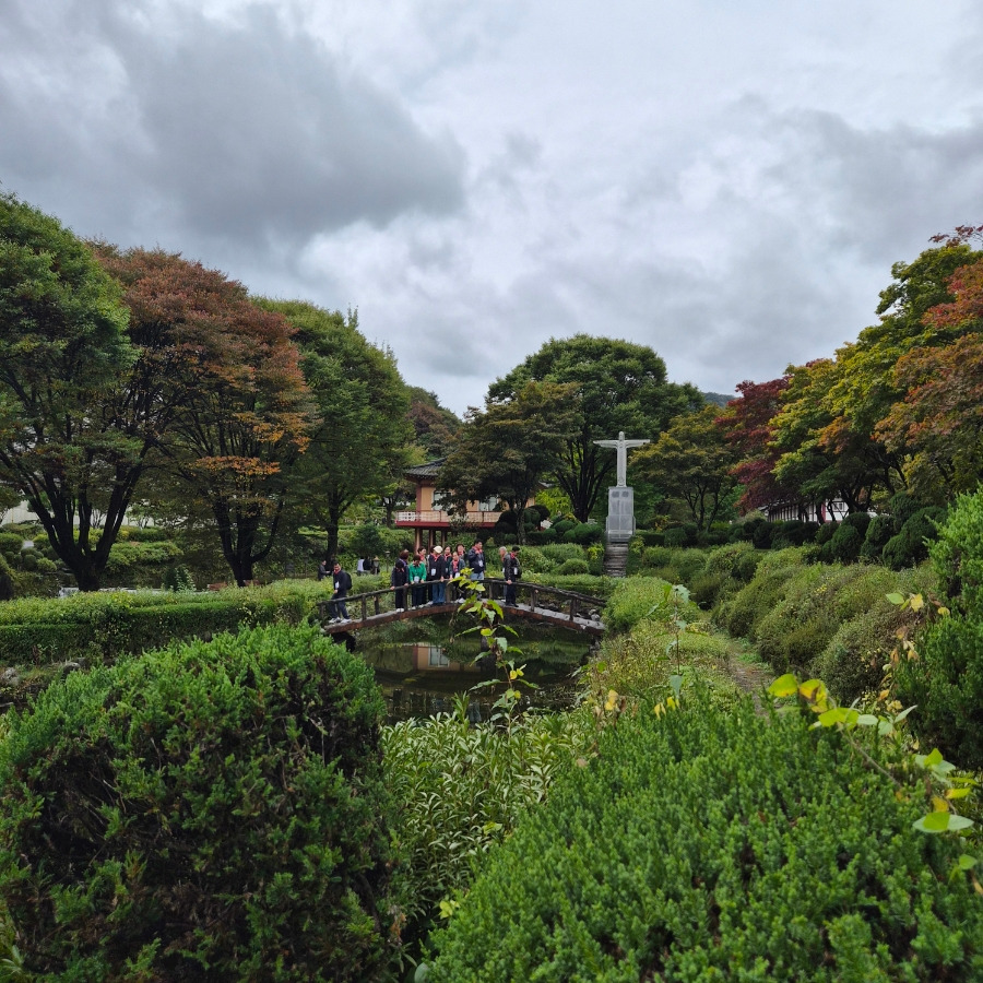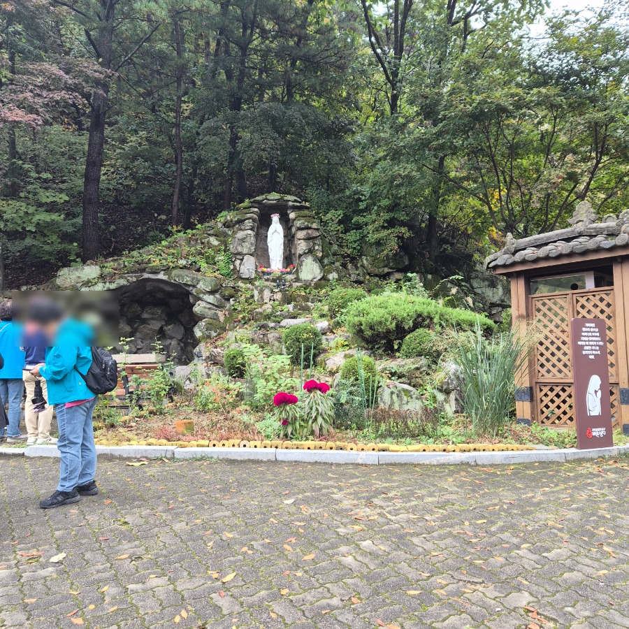 봄에도 가을에도 늘 만차라고 해요. 요 근처 사시는 분이 말씀하시길 날씨 좋은 날은 길이 꽉 메인다고 하더라고요. 제가 간 날도 관광버스로 대절하여 여러 교구의 신도들을 싣고 나르는 버스들이 가득했어요. 2025년 10월 18일 오전의 모습입니다.
