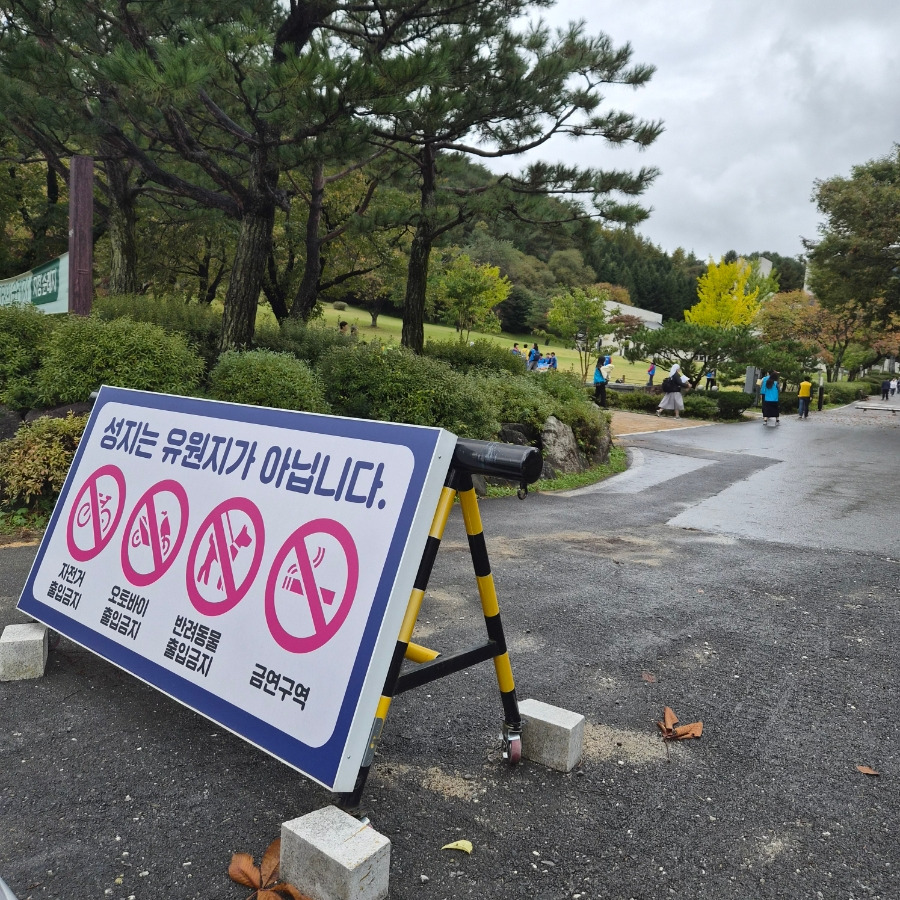 성지는 유원지가 아니어서 기도에 방해되지 않도록 정숙하길 바라요. 또한 게임이나 음주 가무, 취사는 삼갑니다. 애완동물 출입을 금지합니다. 그리고 성지 출입시간은 오전 9시부터 오후 5시까지입니다.