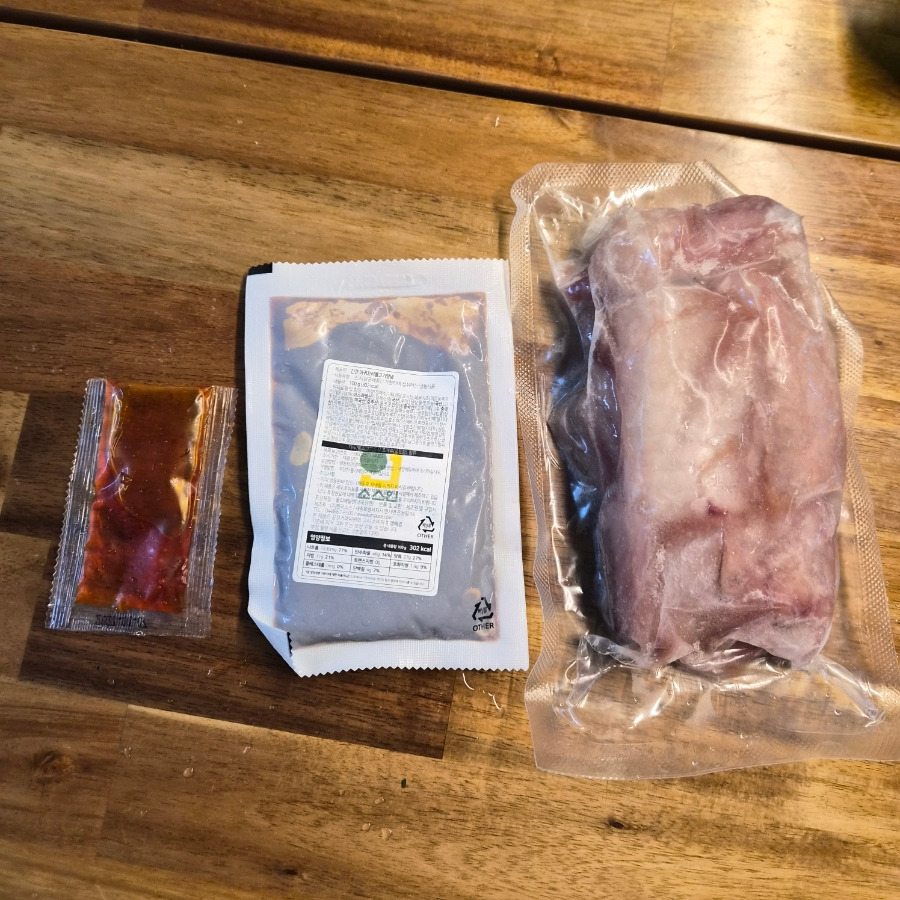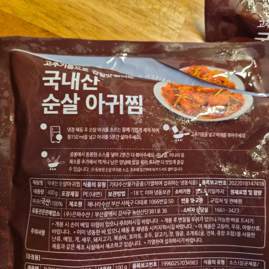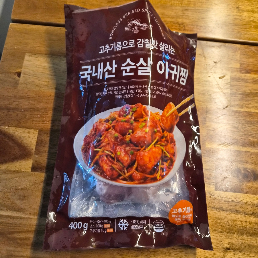 - 봉지의 설명을 잘 읽어요. 안에 소스, 고추기름, 그리고 순살 아귀가 들어 있어요. 깨끗하게 손질된 아귀가 팩 안에 얌전하게 들어 있어요.