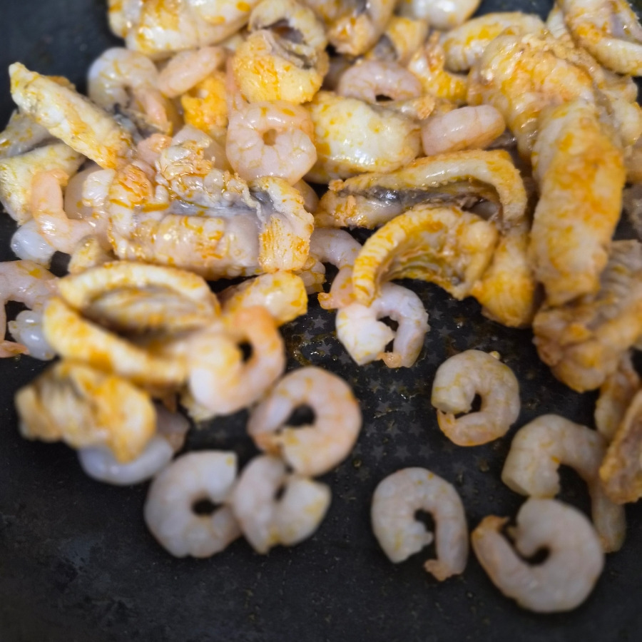 11. 동봉 된 고추기름 2봉지를 프라이팬에 넣고 아귀와 새우 살을 넣고 볶아 줍니다. 살짝 달달 볶아줍니다.