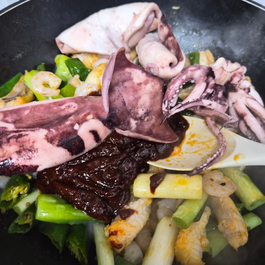 12. 불을 줄이고 나머지 오징어와 야채 그리고 청양고추 그리고 공장장님의 마법 소스를 투하한 후 잘 뒤적여줍니다. 골고루 소스가 묻도록 양손으로 뒤적입니다. 양손 스킬을 이용하니 대단한 요리하는 것 같은 느낌?