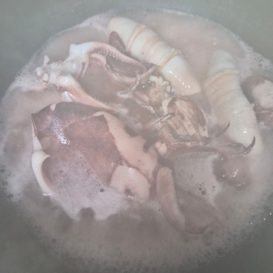 4. 냉동실에 비축한 새우와 오징어를 해동합니다. 오징어는 전자레인지에 살짝 돌려 삶아 줍니다.