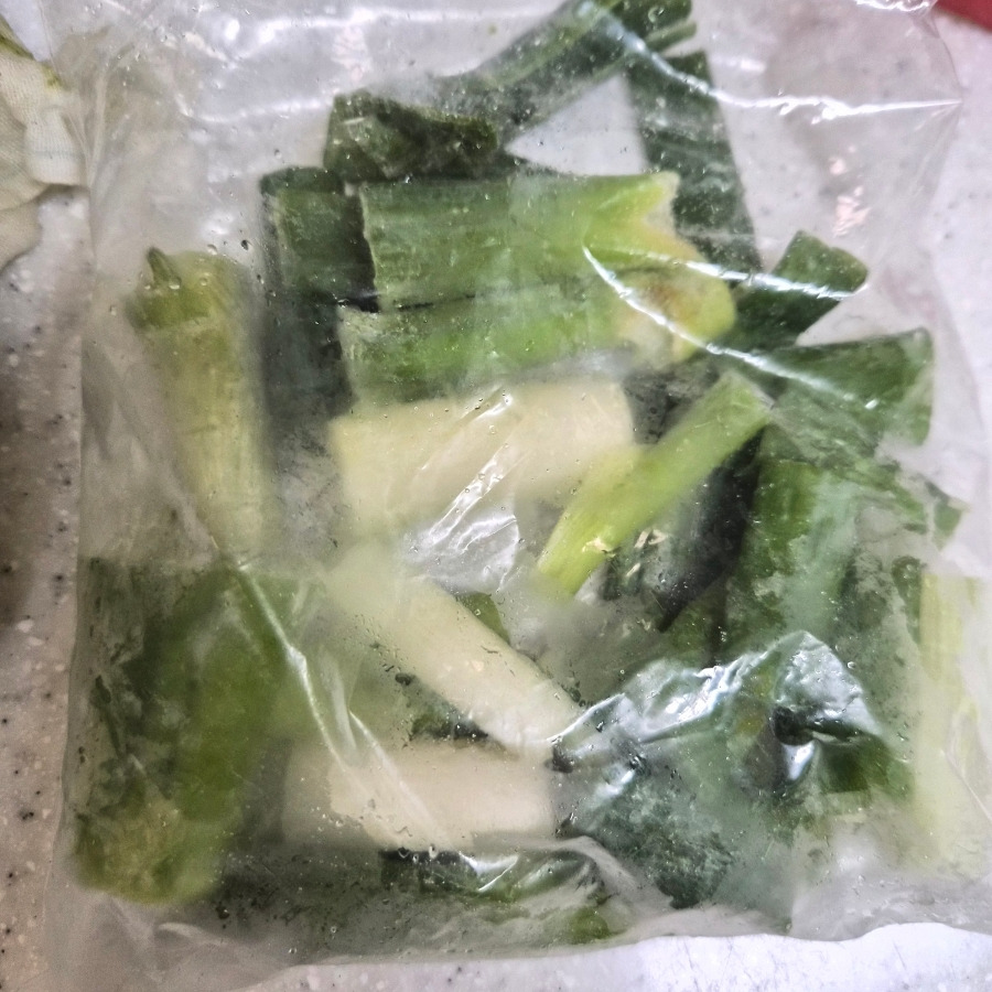 7. 냉동실의 크게 썰어서 준비했던 냉동 파를 2줌 준비합니다. 다양한 용도로 파를 썰어 넣으니 꺼내 먹기에도 좋아요. 물론 싱싱한 파의 맛은 이길 수 없어요. 그래도 남김없이 쉽게 이용하기에는 냉동 파 너무 간편해서 좋아요.