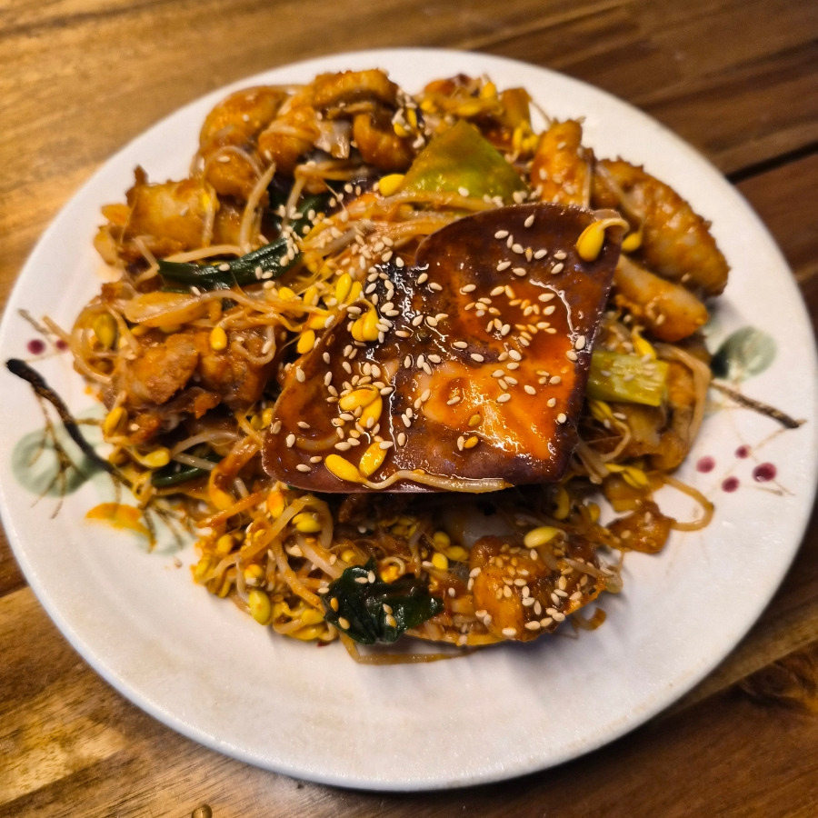 불 맛 국내산 순살 아귀 오징어 새우 찜이 완성되었습니다. 매우 칼칼합니다. 맵찔이 식구들은 속이 얼얼하니 쿨피스가 필요하다고 하며 맛나게 먹어요. 요리의 완성 통깨 톡톡~