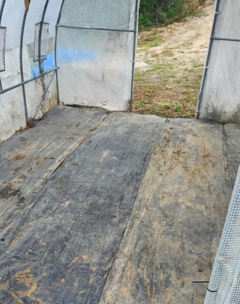 2호 비닐하우스도 제초 매트를 깔아 줍니다. 요기서 1-3호까지 참깨를 말리려고 준비합니다.