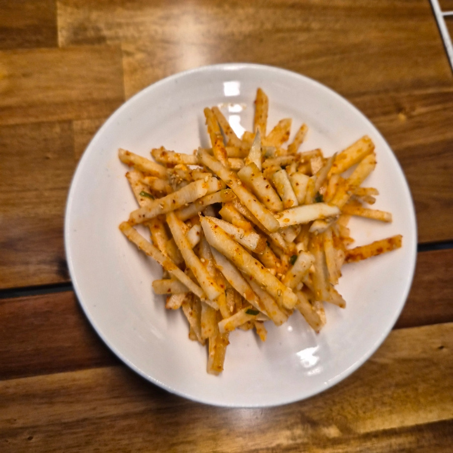 무 보다 더 아삭해서 배 같은 느낌이에요. 너무 얇게 썰지 마세요.