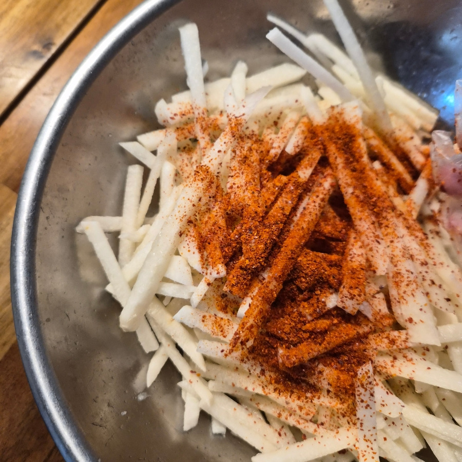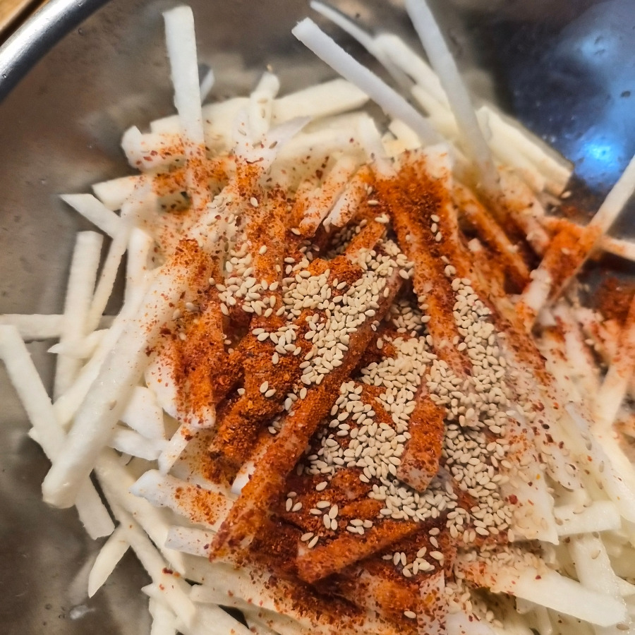 -- 원래 무생채에 식초나 참기름 넣으시는 분들은 더 첨가하셔도 좋을 것 같아요.
