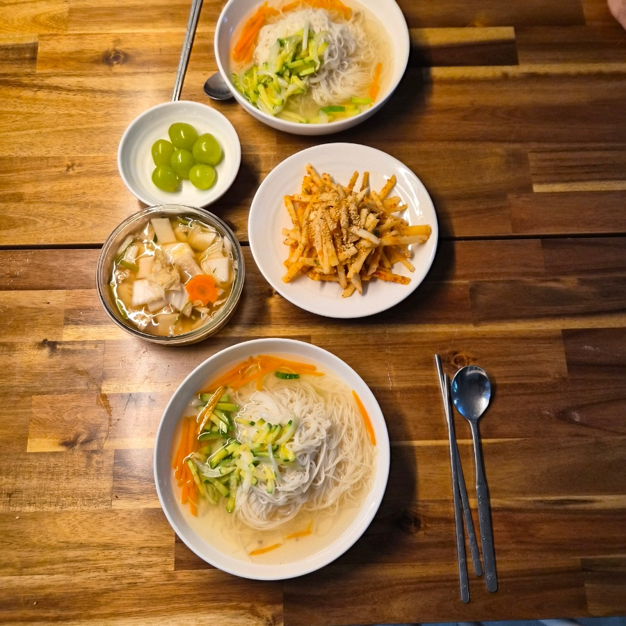 멸치 육수에 국수를 삶아 주었지요. 호박볶음과 당근채 볶음을 넣었어요.