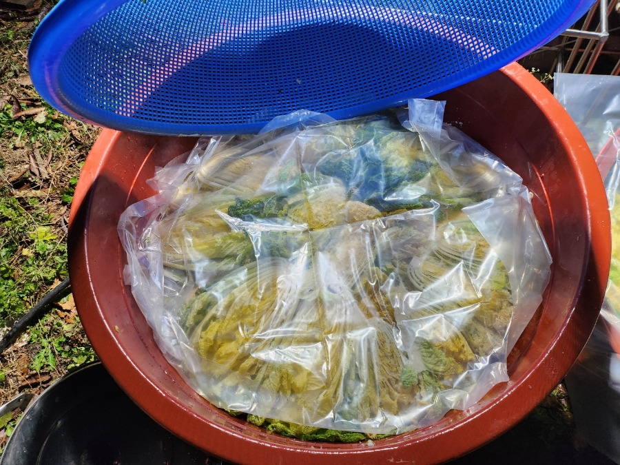 음~ 아래는 잘 절여졌어요. 근데 맨 위에 올린 배추들은 다시 밭으로 가도 될 것 같아요.