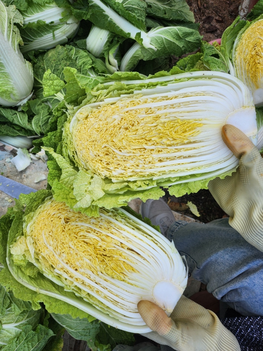 통통한 배추가 반으로 툭~ 잘립니다. 노란 속이 참 예쁘죠?