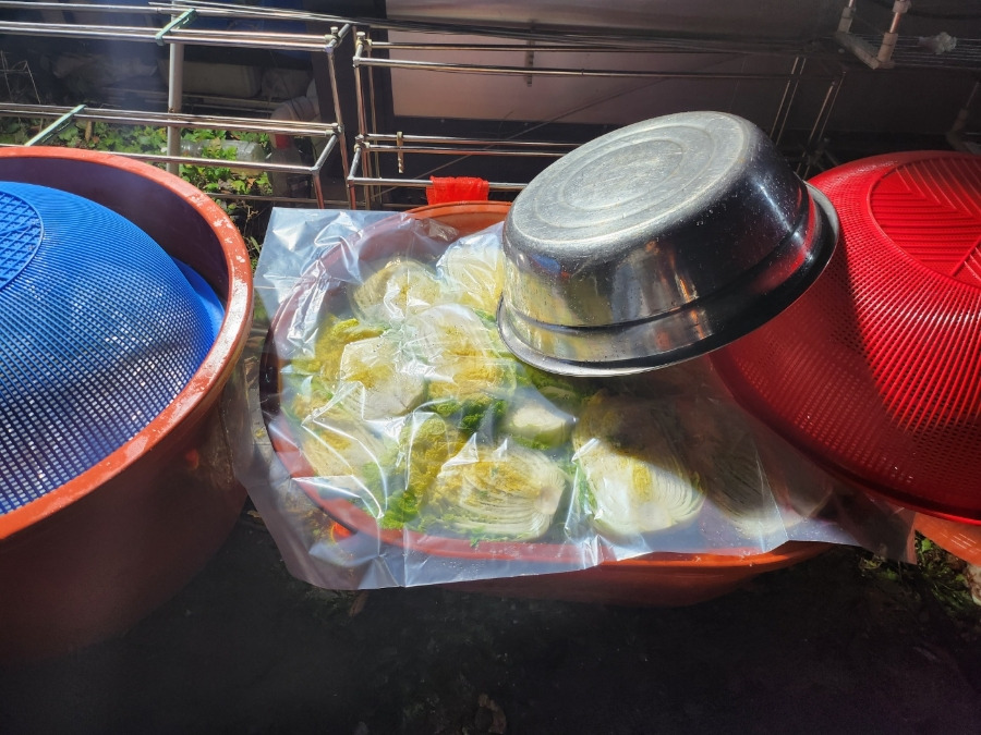 배추를 진하게 탄 소금 물에 담갔다가 고무 통에 올립니다. 차곡차곡 올리고 꽁지 쪽에 소금을 듬뿍 뿌려줍니다.