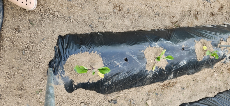 - 비닐 멀칭 위에 구멍을 한 뼘씩 뚫어 물을 흠뻑 줍니다. (비가 온 후 비닐 멀칭을 하면 더욱 좋아요.)