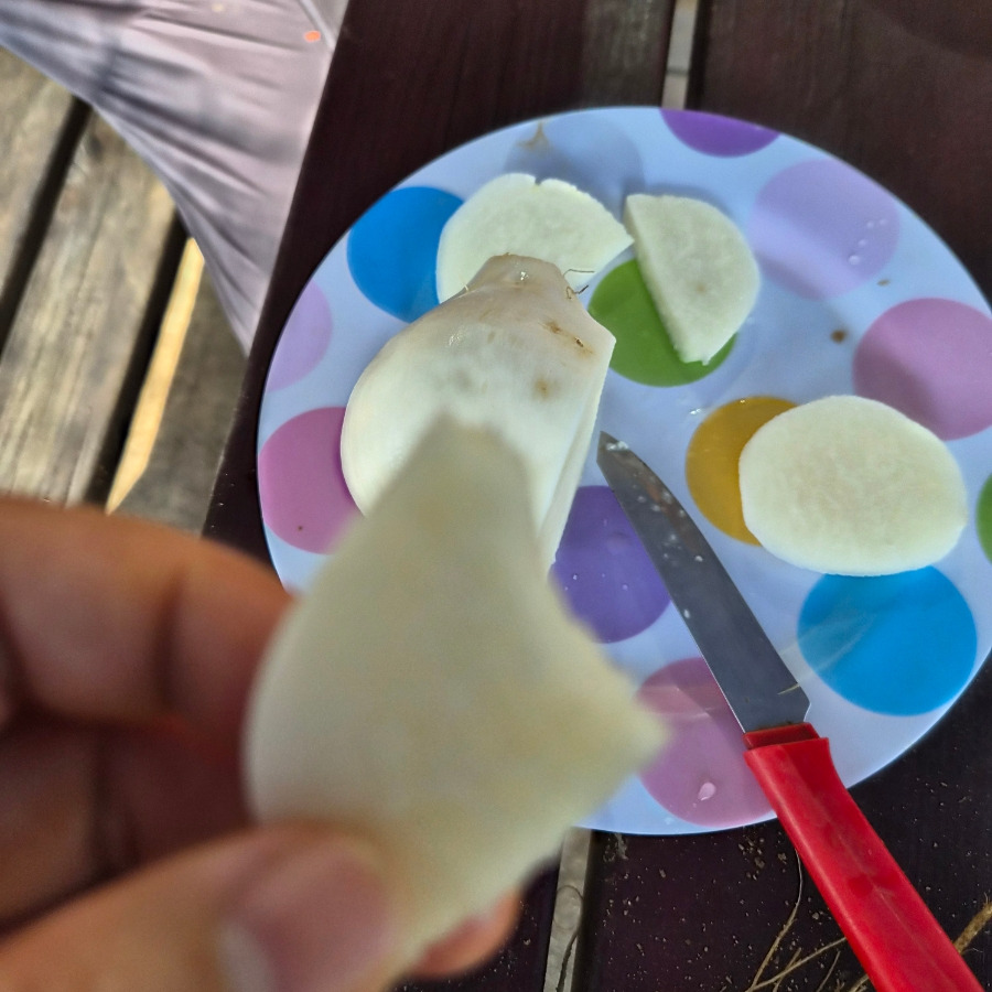 껍질은 귤껍질 벗기듯이 위에서 아래로 벗깁니다. 껍질을 요렇게 훌러덩 잡아당기면 쉽게 벗겨지는 히카마에요. 손질도 쉬워요.
