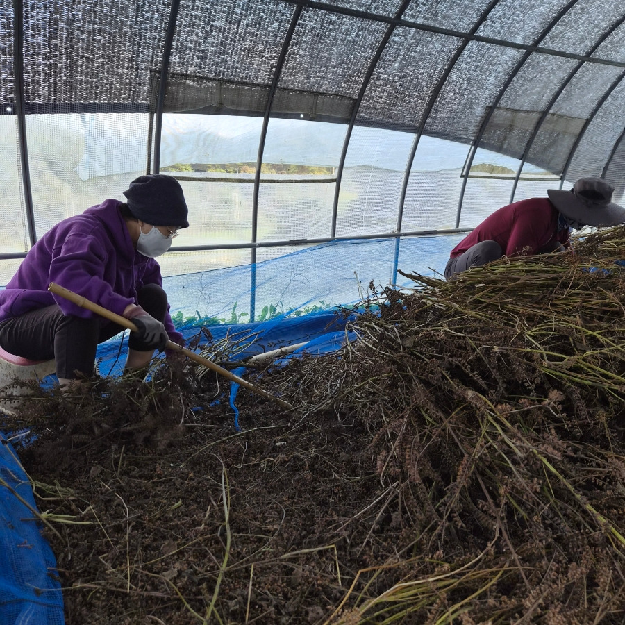 내일 아침에도 부지런히 들깨를 작업하려고 하우스 안으로 옮기고 있어요.
