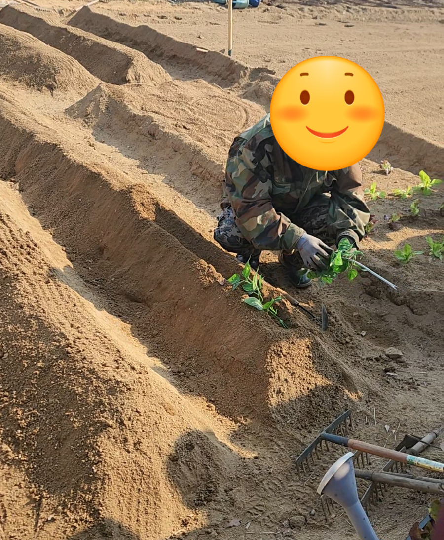 고온일 때는 고구마 끝순이 뜨거운 비닐 위에서 타서 죽기도 해요. 밑에 흙을 올려 순이 뜨거운 비닐에 타지 않도록 도와줍니다.