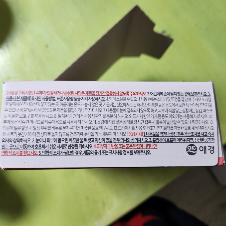 주의점도 읽어 보면 좋겠죠? 피부가 민감하거나 손상된 사람은 제품을 장기간 접촉하지 않도록 주의하라고요. 그리고 어린이. 이분들 정말 조심해야겠죠? 손이 닿지 않는 곳에 보관하세요.