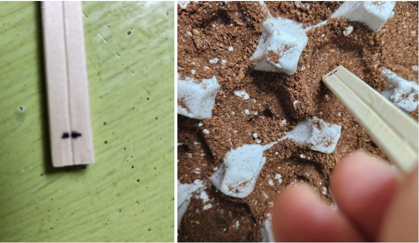 - 나무젓가락에 씨앗 구멍 사이즈를 표시하고 콕콕 배양토를 눌러 씨앗을 심을 구멍을 만듭니다.