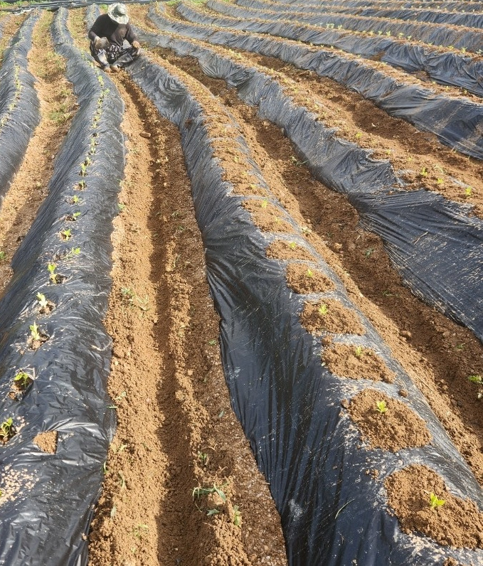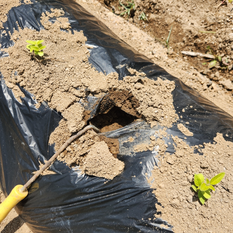 - 이식기를 비닐 멀칭에 푹~ 넣어요.
