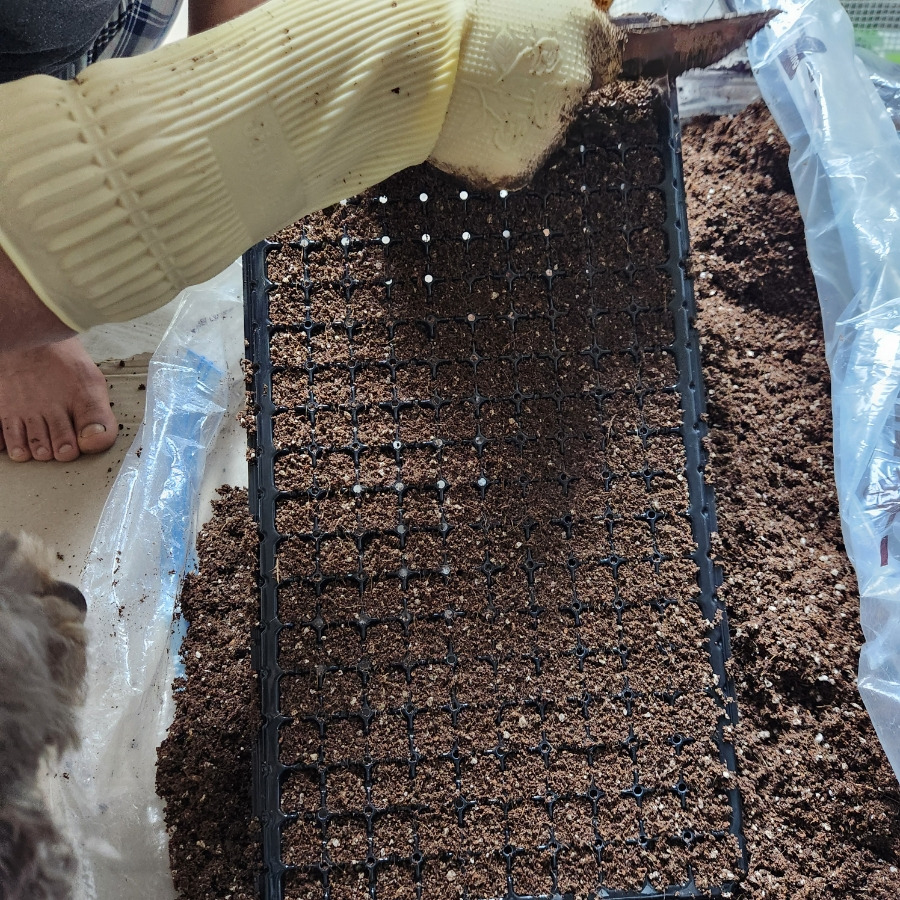 비닐 안에 모종판을 넣고 상토를 넣어요. 판으로 싸악 밀어서 깔끔하게 채웁니다. 박스를 잘라서 테이프로 감아 종이 박스 칼을 만들었어요. ㅋㅋ 요것도 좋은데 다음엔 좀 더 강한 플라스틱 재질이 좋겠어요. 단단해야 젖은 상토를 밀기에 좋을 것 같아요.