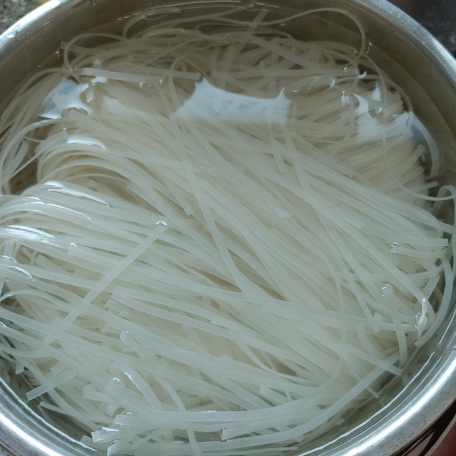 3.쌀국수는 물에 담가 30분을 재웁니다. 끓는 물에 1-2분 삶아서 찬물에 헹궈줍니다.