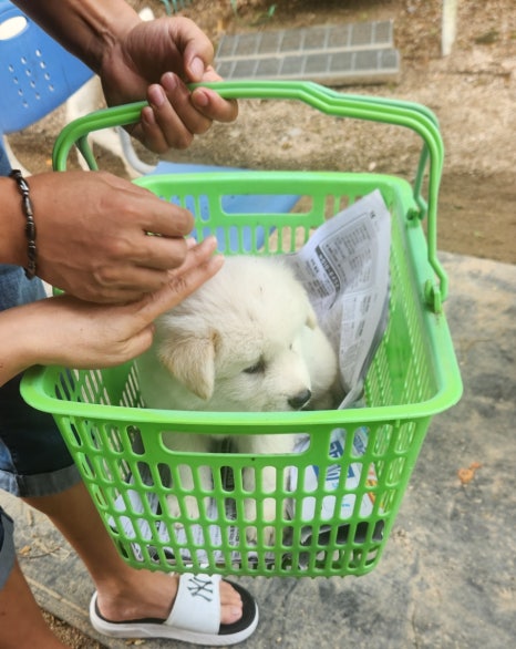 연두 바구니 안에 신문지를 넣고 강아지를 모시고 왔어요.