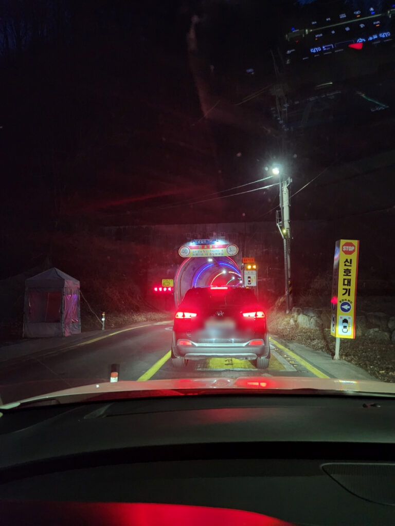 터널 앞에서 신호 대기를 기다립니다. 기다리면 신호가 오죠. 터널 안의 차들이 모두 나오면 신호가 바뀝니다. 천천히 앞으로 출발~
