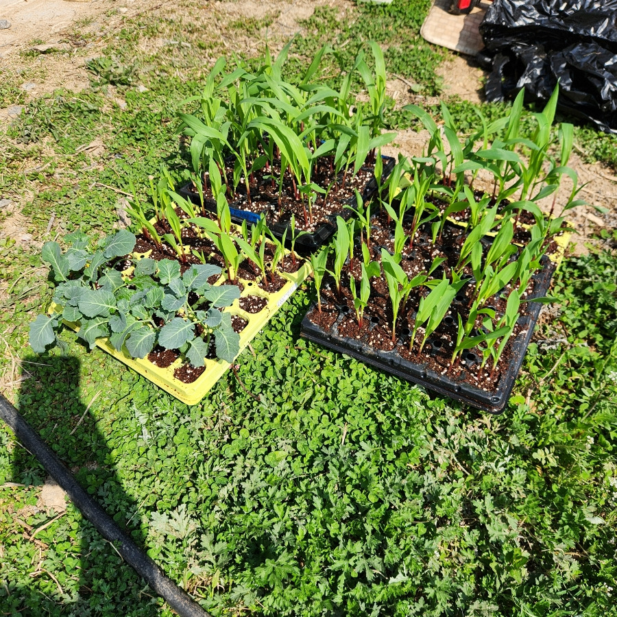 초하 열무를 심었어요. 요건 연두색으로 코팅되었네요. 밭에 구멍을 뚫고 물을 흠뻑 주고요. 거기에 몇 알씩을 넣었습니다. 자라고 나면 열무를 솎아 주면 됩니다. 요렇게 브로콜리도 심고요. 시금치도 심었습니다.