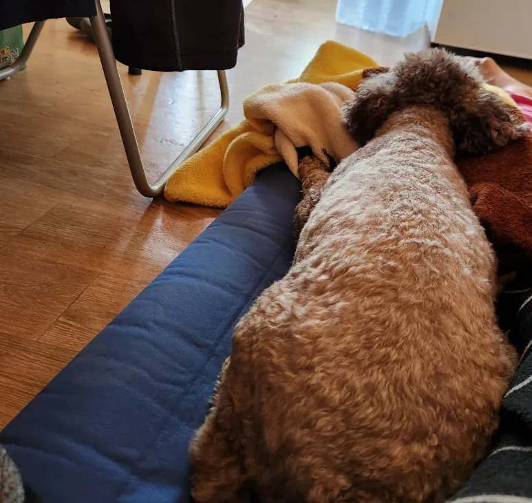 자세히 보면 목걸이와 끈 2세트를 연결했어요. 세트 1개는 마루에게 하고요. 리드 줄 마지막 구멍(검정 리드 줄)에 빨간색 리드 줄을 넣어서 목줄을 잠가 동그라미를 만듭니다. 그렇게 완성된 빨간색 부분에 저의 어깨와 목이 들어가면 착용하기 좋은 어깨 끈으로 변신 됩니다. 그러면 두 손이 편하죠. 일하기에도 편합니다.