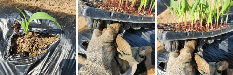 - 옥수수 모종을 구멍 옆에 둡니다. 발근제 없이 키운 옥수수 모종 뿌리 모양이 일반 파는 모종보다 약해요. 살살 달래며 꺼냈습니다. 전문가의 솜씨는 달라요. 달라. ㅎㅎ