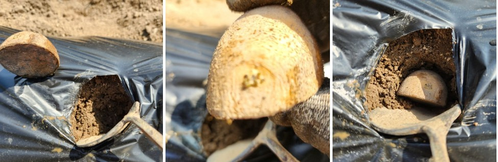 - 비닐 멀칭에 구멍을 뽕뽕 (호미 길이)로 뚫어줍니다.