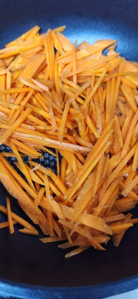당근도 채칼로 간편하게 착착 밀어서 기름에 볶아요. 볶아~