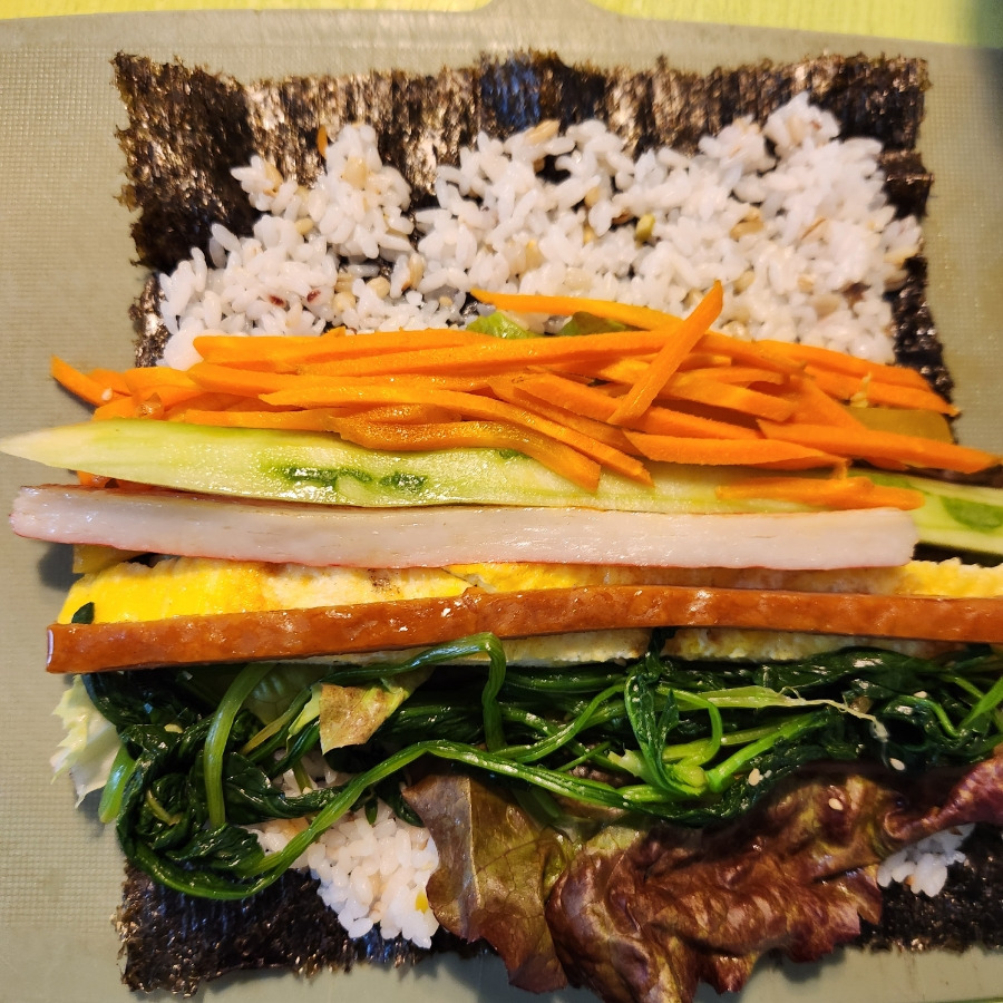 처음으로 제대로 키운 시금치로 만든 김밥입니다. 신기합니다.