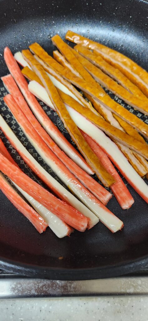 김밥에 햄이랑 맛살이랑 살짝 볶아 줍니다.