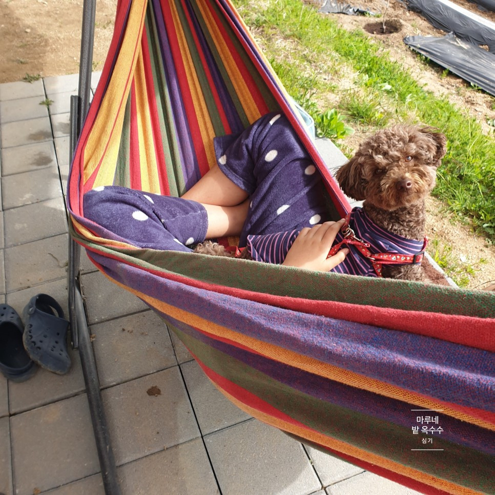 2호와 신나게 해먹을 탑니다. 요기서 낮잠도 자고요. 요기서 엄마가 일을 잘하고 있는지 보고 있어요.