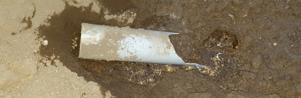 로터리가 지나간 자리에 파이프가 깨졌습니다. 말씀을 드려야 하는데 제대로 전달하지 못해 일이 생기고 말았어요. 파이프가 깨져서 물이 다른 곳으로 흐릅니다. 물이 흘러 내려가는 곳이 아까워 작업을 했는데 ~ 깨지고 말았어요. 속상해요.
