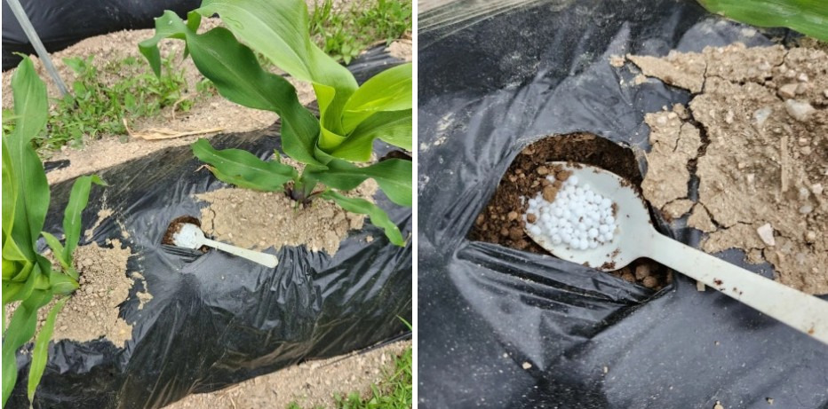 요렇게 옥수수와 옥수수 사이에 구멍을 뚫고 요소를 넣어줍니다. 옥수수 크기가 무릎을 넘길 때 추비를 하면 옥수수가 잘 자란다고 해요.