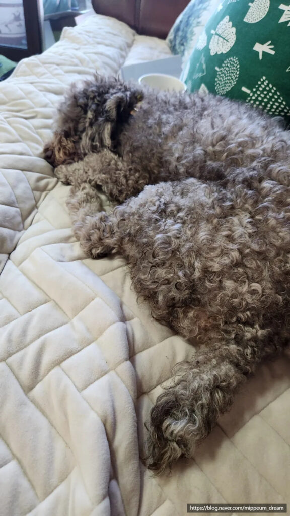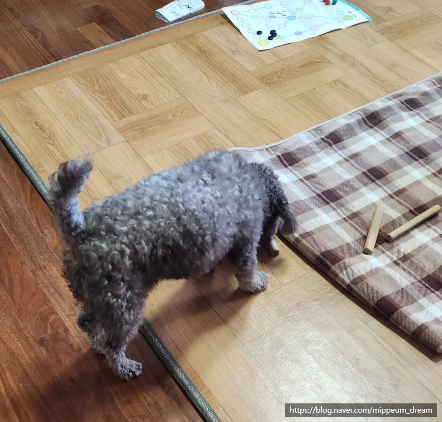 담요 밑에 돈을 넣었습니다. 달달한 마루씨가 냄새를 찾아요. 오늘 치킨 사서 먹을 돈인데 말이죠.