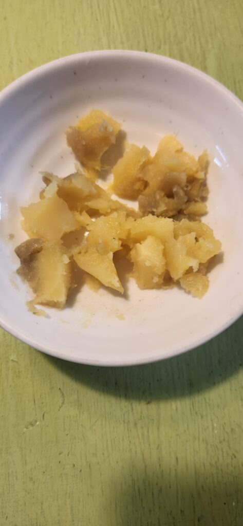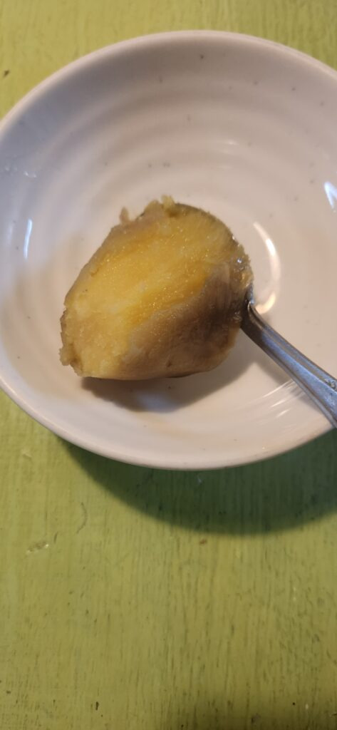 숟가락으로 뚜욱~ 떼어서 접시에 담았어요. 고구마가 촉촉하니 달달합니다.