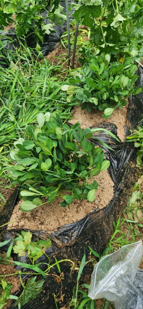6월 말부터 7월 초에 꽃이 피고 지면 자방병이 생겨요. 긴 다리가 생겨요. 이걸 자방병이라고 해요. 자방병이 있는 아이도 있고 없는 아이도 있어요. 우선 땅콩의 비닐만 정리하고 풀을 정리했어요.