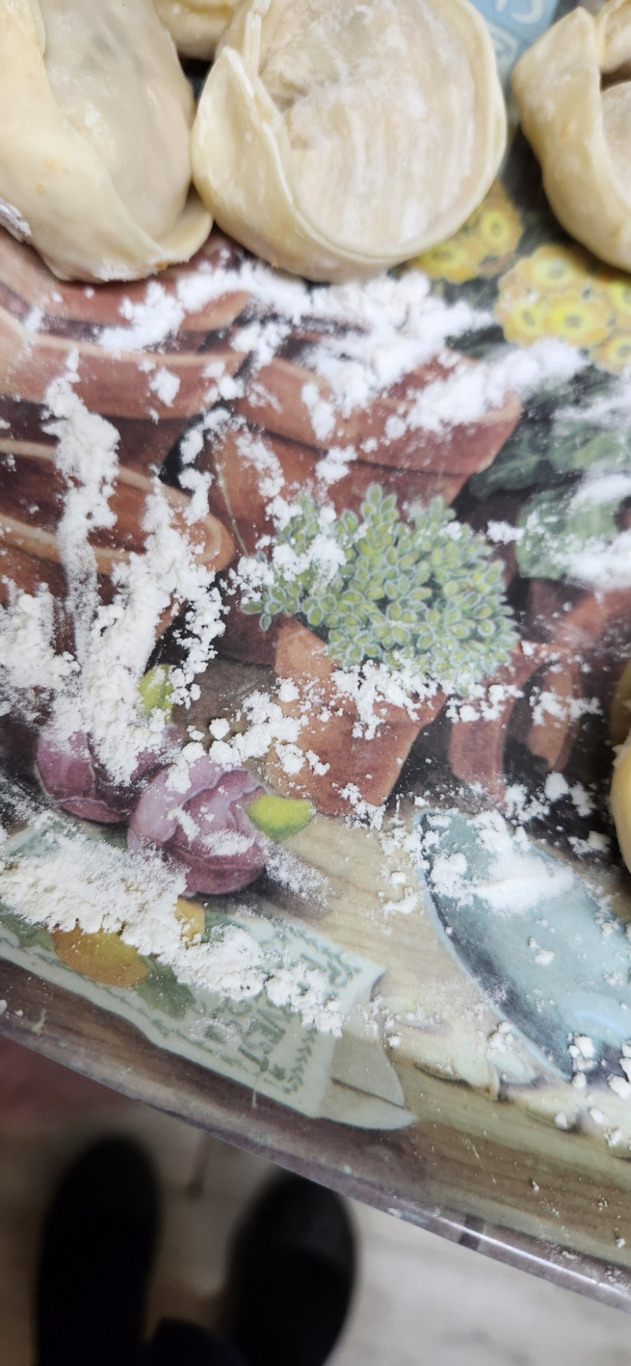 커다란 쟁반 한쪽에 밀가루를 조금 넣고요. 요렇게 만두를 만들면 엉덩이를 살짝 분칠합니다.