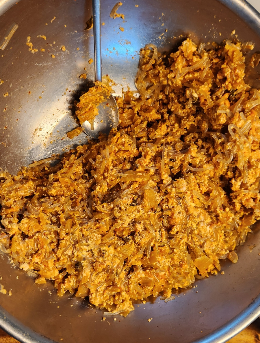 작년 김장김치 반포기/ 간 돼지고기 1근/ 생강가루 조금/ 후추 조금 / 마늘 2 숟가락 / 두부 큰 것 1모/ 당면 큰 한 줌 삶아서 잘라서 넣었어요.