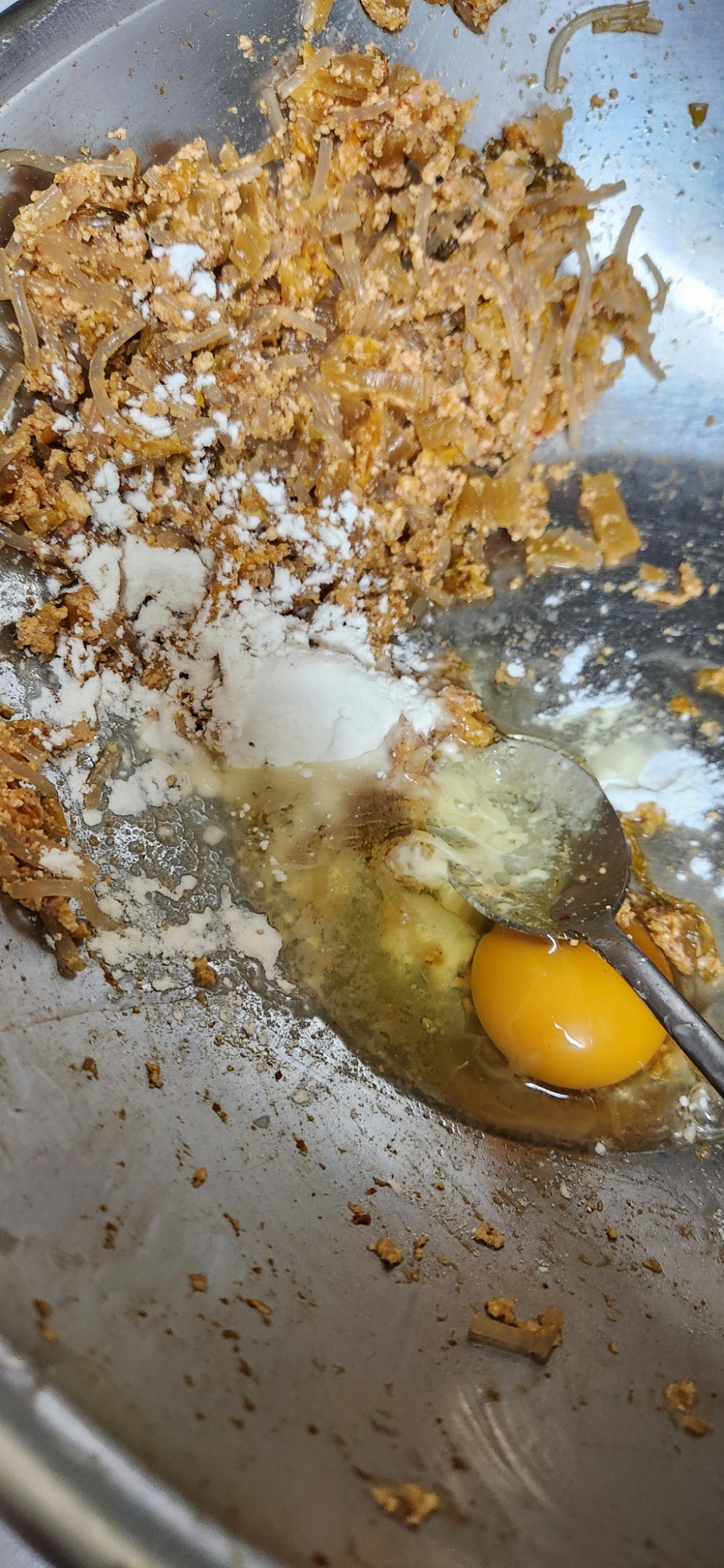 만두 속을 뭉쳐지는 것이 없어서요. 작게 숟가락으로 떠서 전을 만드는 것이 좋아요.